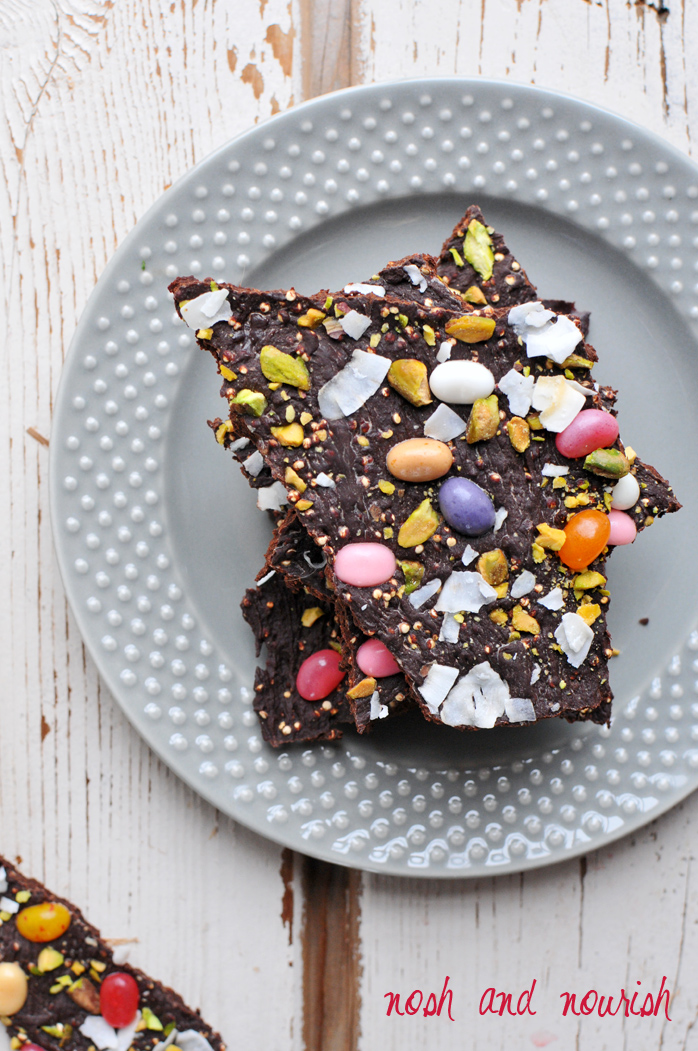 Overall, I'd say this is a health(ier) Easter dessert than most. It starts with 62% Cacao Dark Chocolate. Once melted, it's infused with coconut milk and toasted quinoa. Then, comes the delicious toppings: