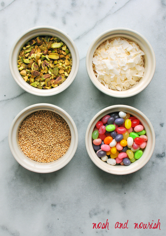 I am of the philosophy that life is all about balance. Some of you might be freaking out that I used jelly beans in a recipe... on a healthy food blog. I know. They're filled with corn syrup and dye to make those pretty colors. I would never suggest eating them daily. Or even monthly. But once a year for an Easter treat? In the grand scheme of life, you'll be ok. 6 jelly beans won't kill you. And they're so darn cute... and festive!